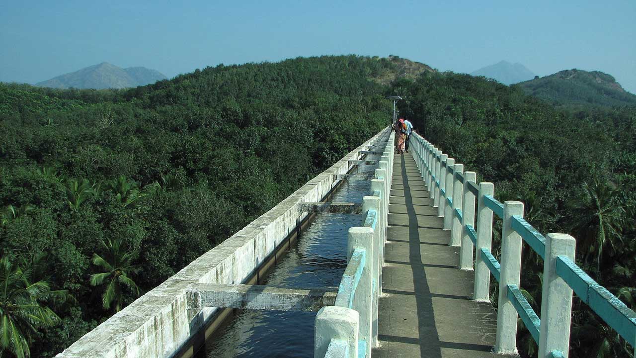 Mathur Aqueduct (Mathoor Hanging Bridge), located in Kanyakumari district, Tamil Nadu, is the longest and tallest aqueduct in South India. Built across the Pahrali River, this 115 feet high and 1,000 feet long bridge offers breathtaking views of the Western Ghats, lush green landscapes, and flowing waters below.